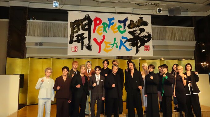 2008年から始まり、今年で4回目の開催となる「PERFECT YEAR」は、LDHグループの総力をあげたLDH総合エンタテインメントの祭典。会見の前には、書道8段の実力を持つTAKAHIROさんがSHOINGアーティストの吉川壽一さんとともに書道パフォーマンスを行い、「PERFECT YEAR 開幕」と多彩なカラーを使って力強い字で書き上げました。