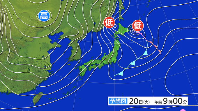 20日(火)午前9時の予想天気図です。北海道の西の海上に低気圧がありますが、北東へと進み、西高東低、冬型の気圧配置になる見込みです。