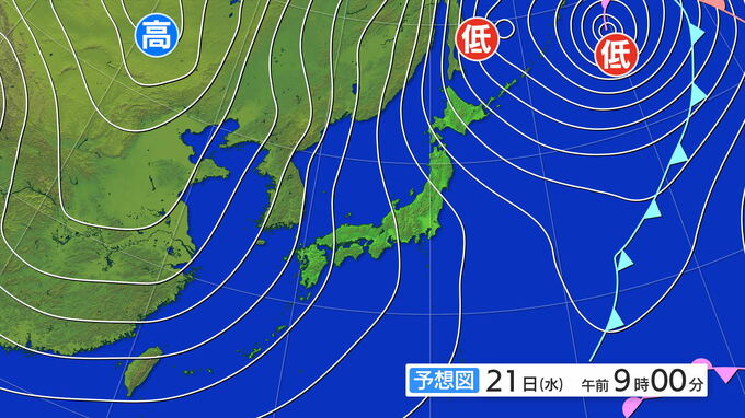 21日(水)午前9時の予想天気図ですが、冬型の気圧配置が続くでしょう。