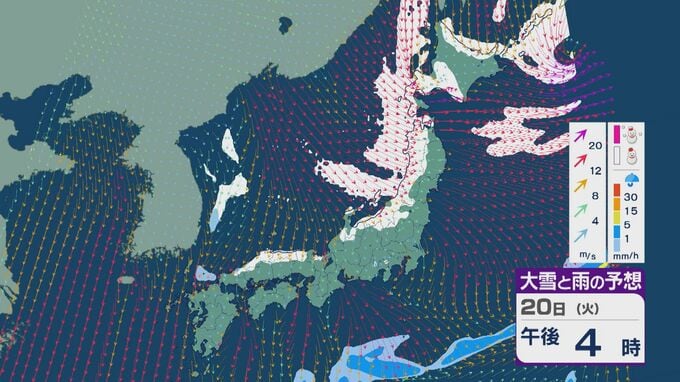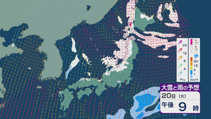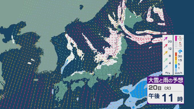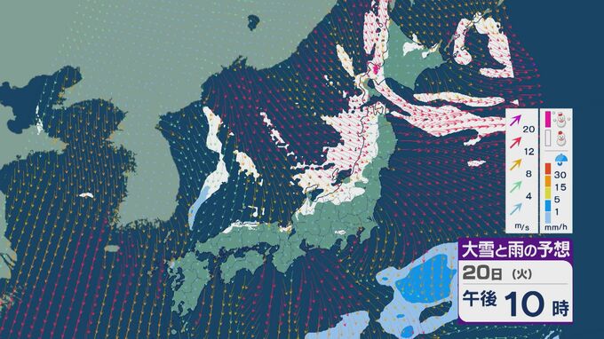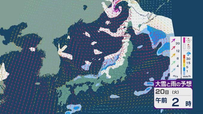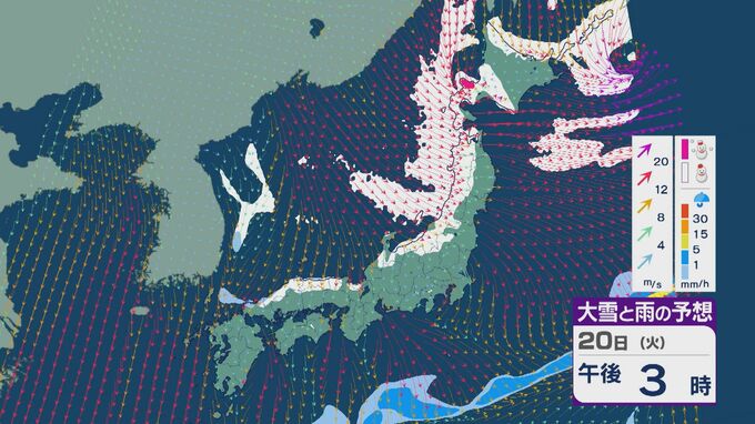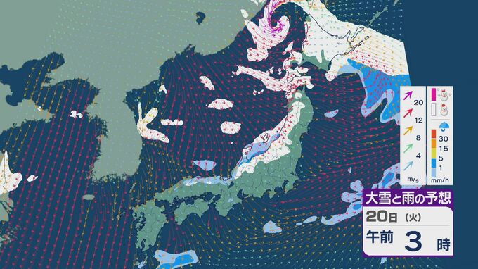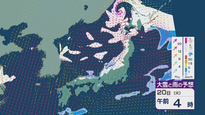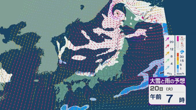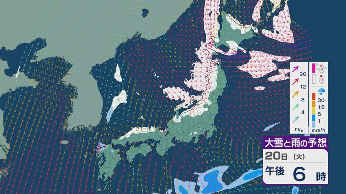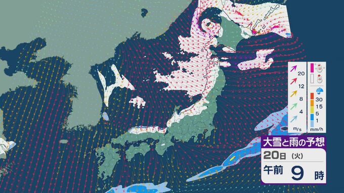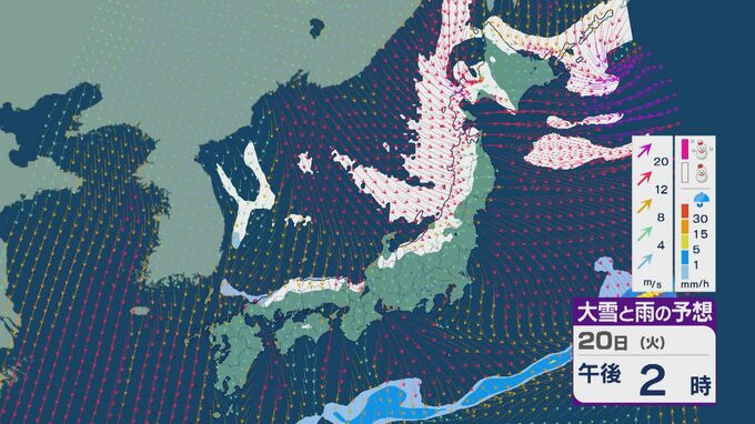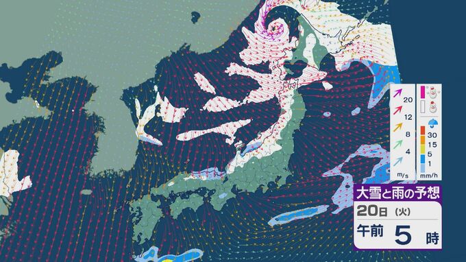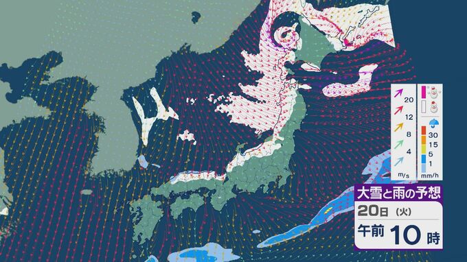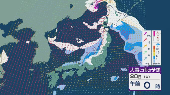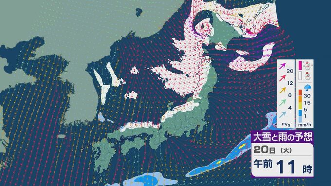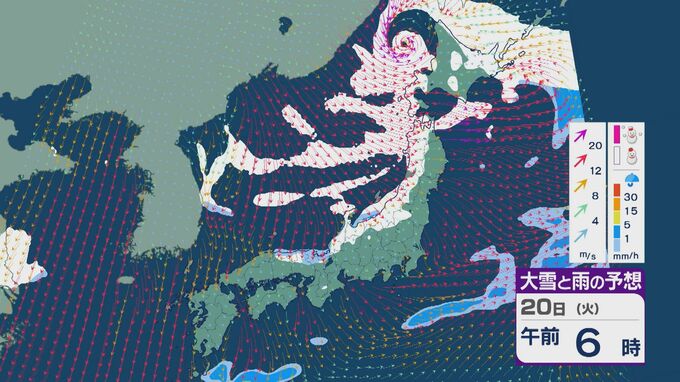 【大雪情報】大寒の20日(火)から“冬型気圧配置”と“強烈寒波”が続く見込み 北陸など日本海側では大雪が週末にかけて続くおそれ 交通障害などに注意・警戒を 雪・雨と風シミュレーション 北陸放送 2026年1月19日(月) 09:35 国内 20日の雪・雨と風の予想ですが、午前中から山陰より東の日本海側で雪が降る見込みです。
