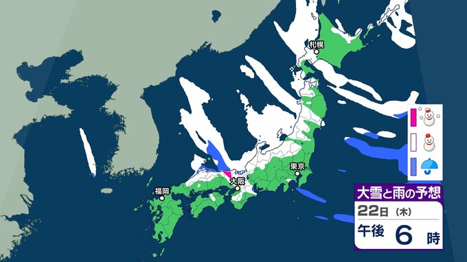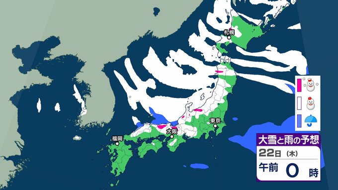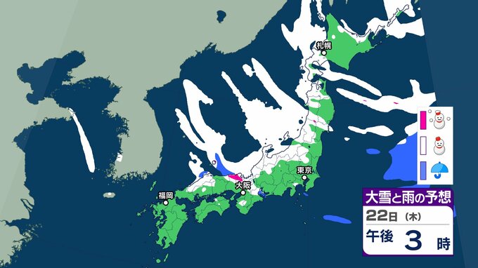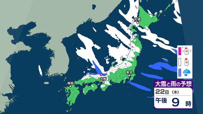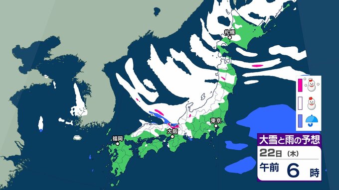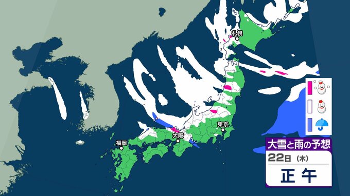 【雪の予想】21日「JPCZ」形成の見込み 東~西日本では20~21日は強風・風雪などの注意・警戒 北~西日本では21日大雪による交通障害に注意・警戒を【気象庁19日(月)~24日(土)の雪雨シミュレーション/19日現在】 RSK山陽放送 2026年1月19日(月) 09:06 国内 天気 22日(木) 気象庁の雪と雨のシミュレーションをみると、22日は、東北や北陸、近畿、山陰の一部などで大雪となるところもある見込みです。