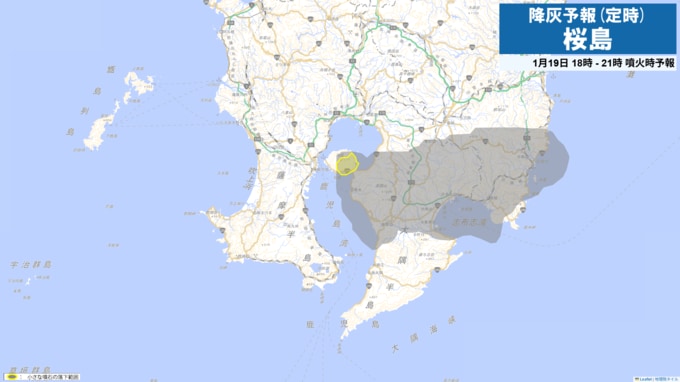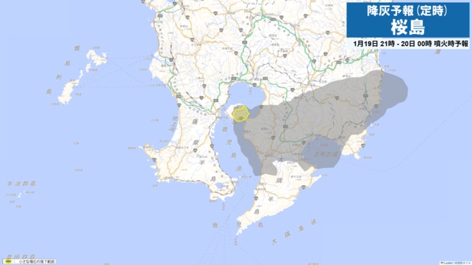 19日9時から20日3時までに噴火が発生した場合には、以下の方向・距離に降灰及び小さな噴石の落下が予想されます。