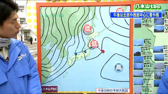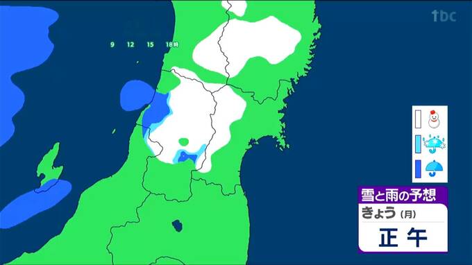 正午頃の予想では、西部の山沿いで雪が降り始めます。早ければ昼前から山沿いでは雪や雨が降ってきそうです。