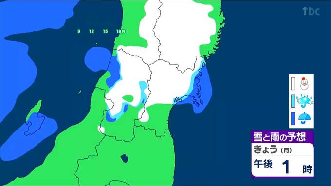 昼過ぎには、雪雲や雨雲が東の方に流れ込んできます。沿岸部では雨で降るところもありそうですが、内陸を中心にやや広く雪が降る見込みです。