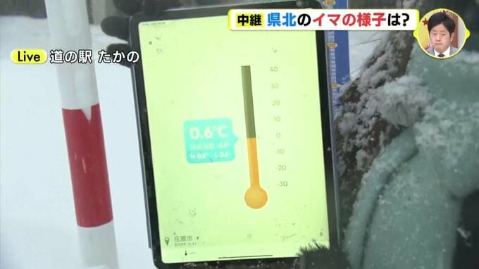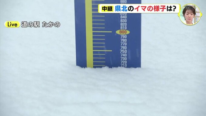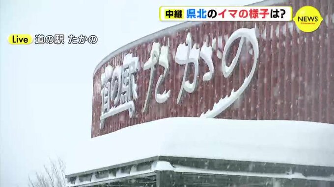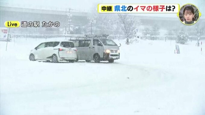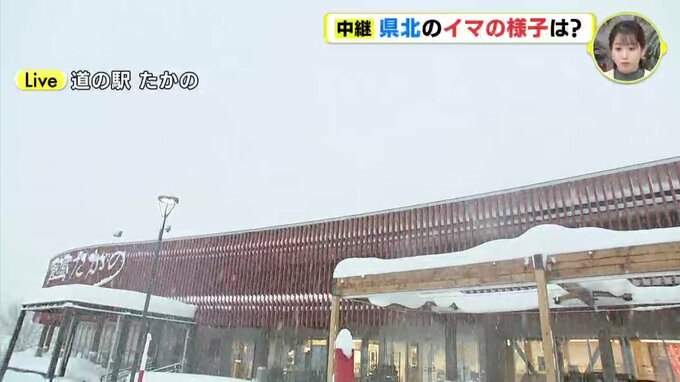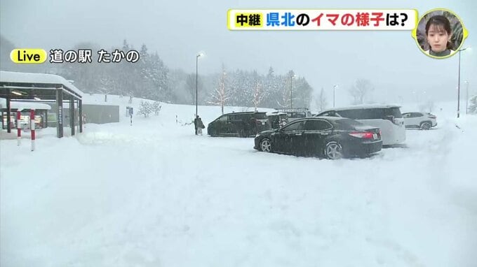 「広島・庄原市にあります道の駅たかのに来ています。午後3時台にお伝えした中継のときよりも上空の雲はかなり厚くなっていて、視界もより悪くなっている印象です。雪の粒がとても大きいので積雪の量も増えてきました。