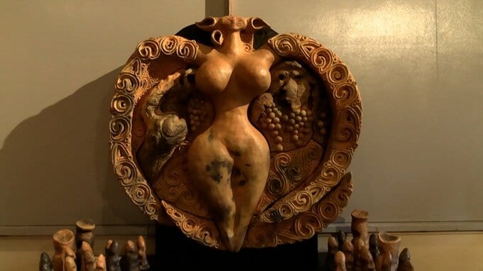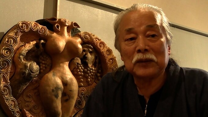 「大地」を女神の姿で表現した作品には地球温暖化が深刻化する中「失われた自然を取り戻そう」というメッセージが込められています。新見市に住む芸術家、猪風来さんが、自身で運営する美術館で開いている作品展です。会場には縄文土器などから着想を得て制作した新作、合わせて14点が並んでいます。亡くなった息子、村上原野(むらかみげんや)さんの作風を踏襲した作品もあります。