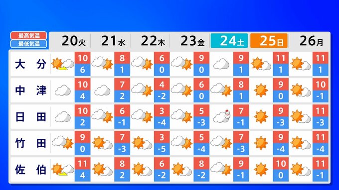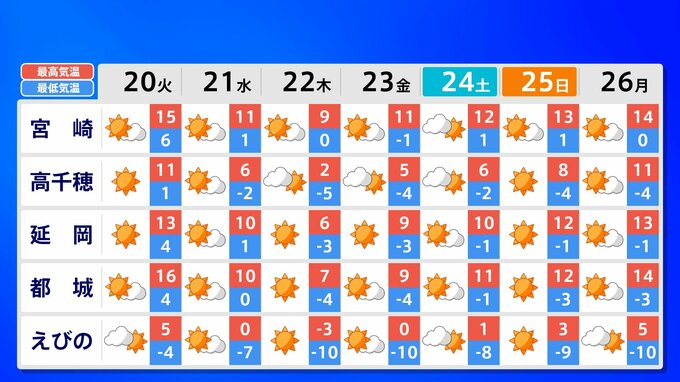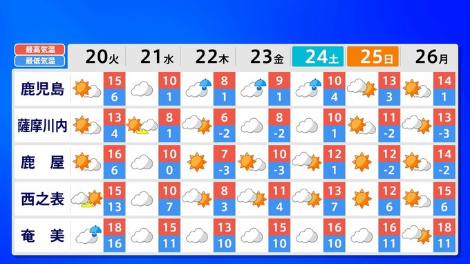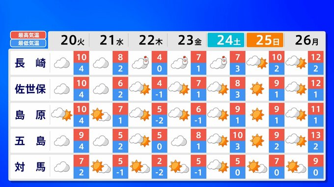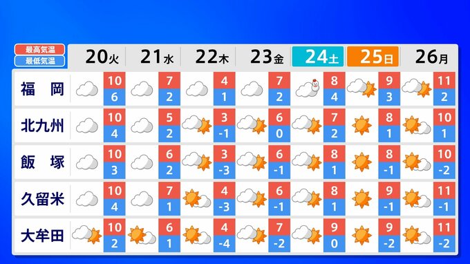 【”寒波”が来る】九州にも「雪」の予報「雪はいつ どこで」【雪シミュレーション20日(火)~24日(土) / 九州各都市の週間予報】福岡・佐賀・長崎・大分・熊本・宮崎・鹿児島 南日本放送 2026年1月19日(月) 12:05 国内 天気 九州地方各都市の週間予報(20日(火)~ 26日(月)) 週間予報を画像で掲載しています(各都県5か所ずつ)。福岡県の場合、福岡市・北九州市・飯塚市・久留米市・大牟田市の5か所です。「雪の予報」が『福岡・佐賀・長崎・熊本』に発表されています。 この記事をはじめから → 寒波が来る 九州も雪のおそれ「雪シミュレーション」