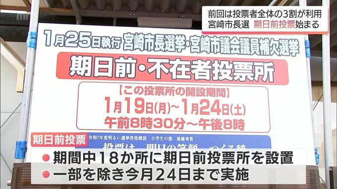 18日に告示された宮崎市長選挙は、19日から期日前投票が始まりました。宮崎市選挙管理委員会は19日から期日前投票所を設置していて、このうち、宮崎市役所の敷地内にある投票所には、朝から多くの有権者が訪れ一票…