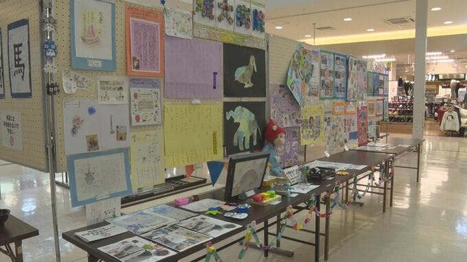 会場となっているサンエー西原シティ(西原町)には、特別支援学校や病院に設置された「院内訪問学級」に通う子どもたちが制作した約100点の作品が展示されています。