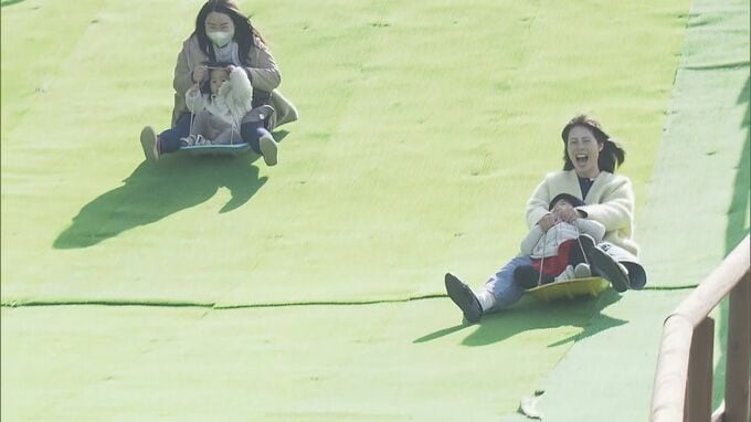 このうち「渥美半島菜の花まつり」のメイン会場、伊良湖菜の花ガーデンには、120万本もの菜の花が植えられています。訪れた人は、一面に広がる黄色のじゅうたんの中で、幸せを呼ぶという黄色いポストとの記念撮影やソリでの芝滑りを楽しんでいます。