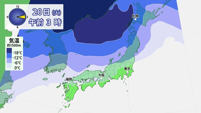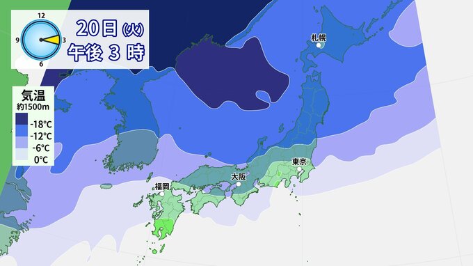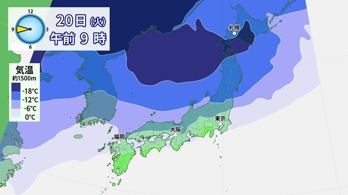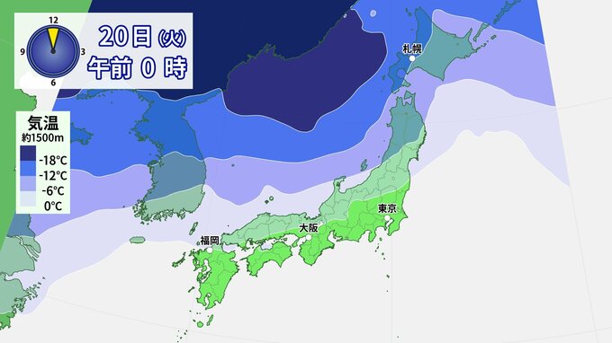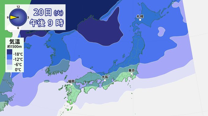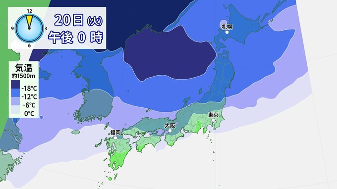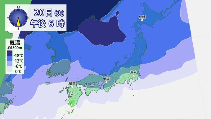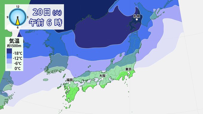 あす20日(火)は、上空約1500メートル付近でマイナス6℃以下(平地で雪の目安)の寒気が次第に西日本付近に南下するでしょう。