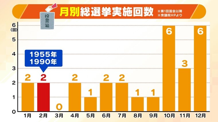 これまでの月別の総選挙の実施回数を見ると、10月と12月がそれぞれ6回と最多となっています。2月は1955年と1990年に実施されていますが、高市総理の意向通りに衆議院解散総選挙となれば、36年ぶりとなります(※第1回国会以降、衆議院HPより)。