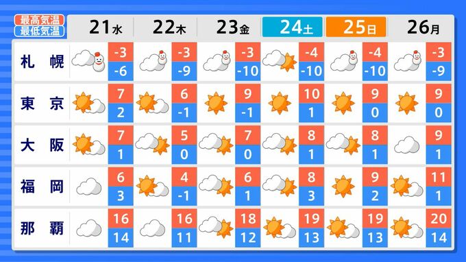 日本付近は21日から25日頃にかけて、強い冬型の気圧配置が続く見込みです。北日本から西日本では日本海側を中心に大雪による交通障害に注意・警戒し、着雪やなだれに注意してください。