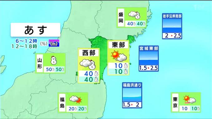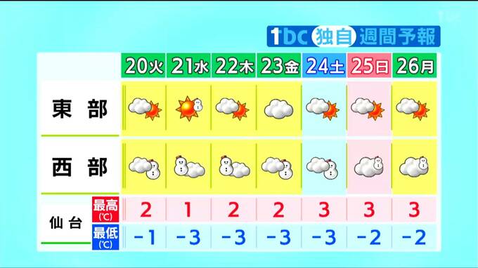 最高気温は平年より4℃前後低く、高い所でも2℃くらいで、古川では真冬日となる見込みです。
