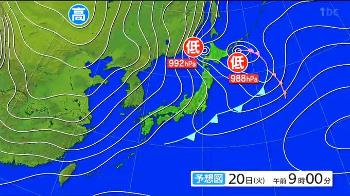 20日午前9時の予想天気図です。低気圧が北海道の東で発達し、冬型の気圧配置が強まるでしょう。北日本では警報級の強い風が吹く可能性があります。
