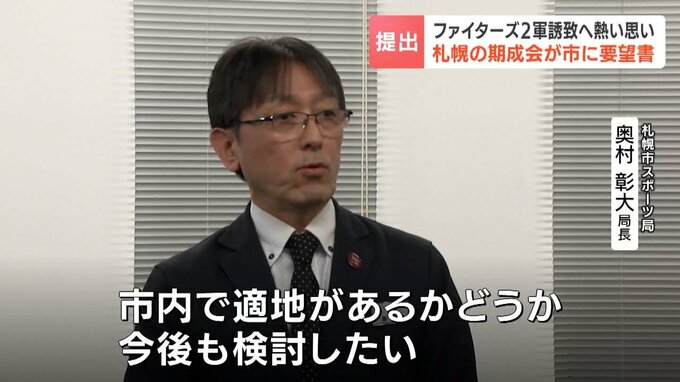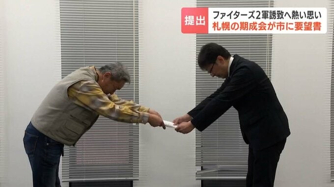 ファイターズ2軍誘致を求める札幌の期成会のメンバーらは19日、札幌市の奥村スポーツ局長に要望書と署名を手渡しました。