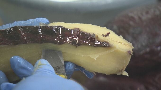 鮮やかな黄色に輝く「干しいも」。寒さが厳しいこの時期、福島県郡山市では生産の最盛期を迎えています。