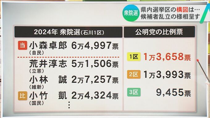 一方で公明党の比例票が金沢市では1万3658票ありました。このうちの多くが自公連立により小森氏に入っていた票だとみれば、今回は新党の候補と目される、前回2番手だった荒井氏に票が流れるという見方が強まっています。