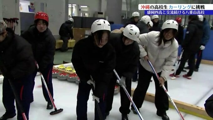 19日は両校の生徒がカーリングに挑戦。最初は慣れない氷の上に悪戦苦闘していた八重山高校の生徒たちでしたが、高校対抗で試合が行われると八重山高校が勝利するほどすぐに上達していました。