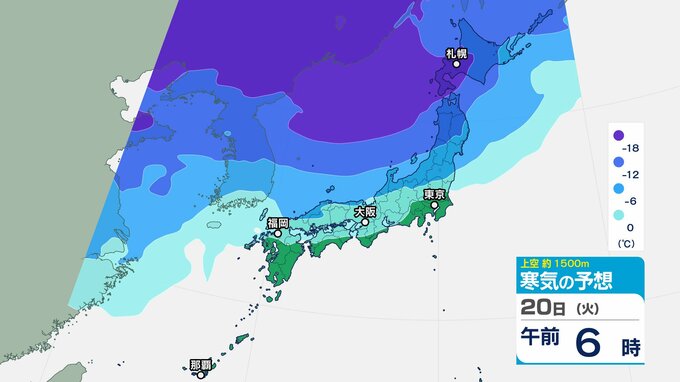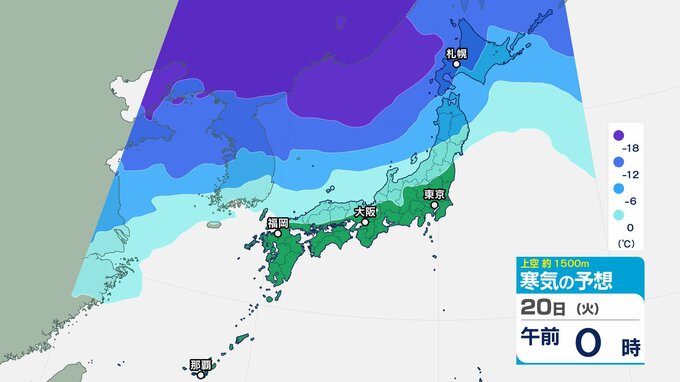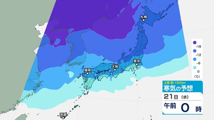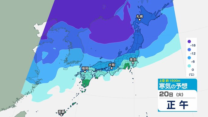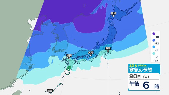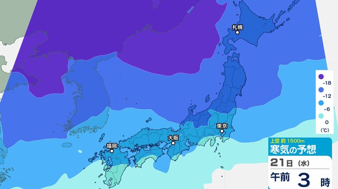東日本の上空約5000メートルには断続的に氷点下40度以下の強い寒気が流れ込み、西日本の上空約1500メートルには、氷点下12度以下の強い寒気が流れ込む見込みです。