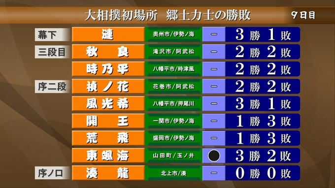 錦木は白鷹山に押し出しで敗れる 再び黒星先行 大相撲初場所9日目 岩手県出身力士の勝敗 IBC岩手放送 2026年1月19日(月) 18:16 国内 大相撲初場所9日目の郷土力士の勝敗です。 18日に星を五分に戻した盛岡市出身、東十両12枚目の錦木は、白鷹山に押し出しで敗れ再び黒星先行です。 序二段の東颯海も敗れてこれで3勝2敗です。その他の郷土力士の取り組みはありませんでした。