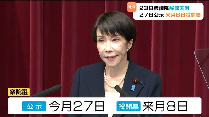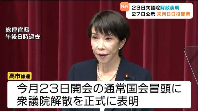 高市総理は、19日夕方会見し、1月23日に開会する通常国会の冒頭に衆議院を解散することを正式に表明しました。これに伴う衆議院選挙は、1月27日に公示され、2月8日に投開票が行われます。