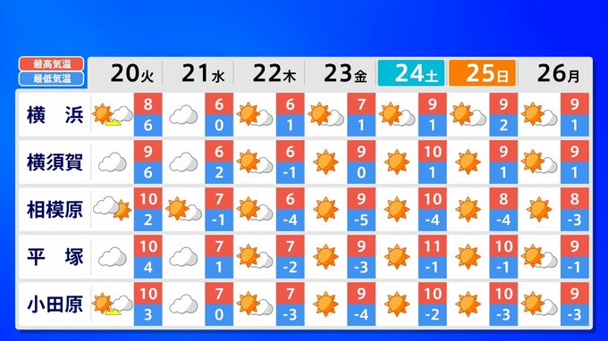 週間予報を画像で掲載しています(各都県5か所ずつ)。神奈川県の場合、横浜市・横須賀市・相模原市・平塚市・小田原市です。21日(水)と22日(木)の東京都心の予想最高気温は『6℃』と、今シーズン一番の寒さとなりそうです。今回の『寒波』は長いため、体調管理に努めてください。