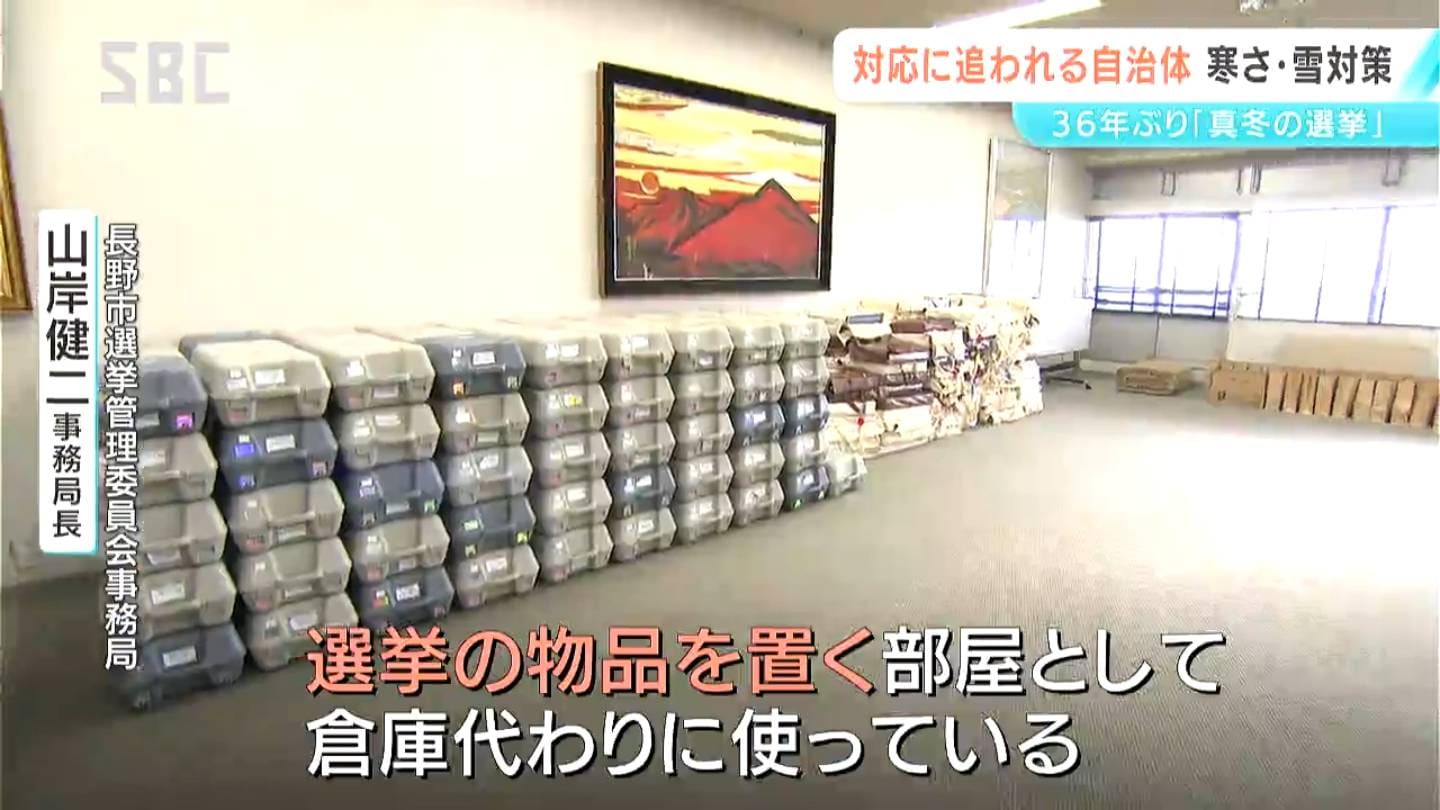 長野市選管 山岸健二事務局長:「普段は会議室だが、空けてもらい選挙の物品を置く部屋として倉庫代わりに使っている」