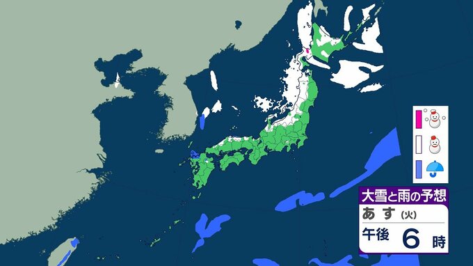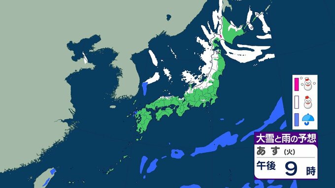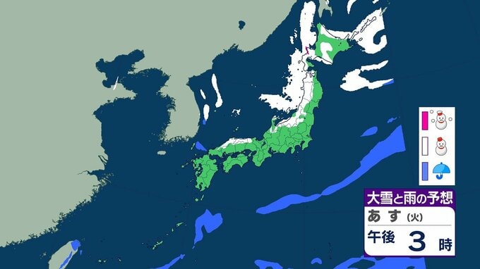 【大雪情報】21~25日ごろにかけ大雪のおそれ 北陸では最大100センチ 東北・近畿では70センチ予想 交通障害などに警戒を 全国の3時間ごとの雪のシミュレーション(気象庁) テレビ山口 2026年1月19日(月) 20:07 国内 あす(20日)午後の雨と雪のシミュレーション