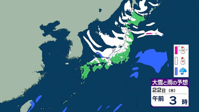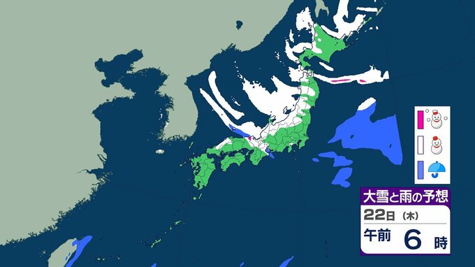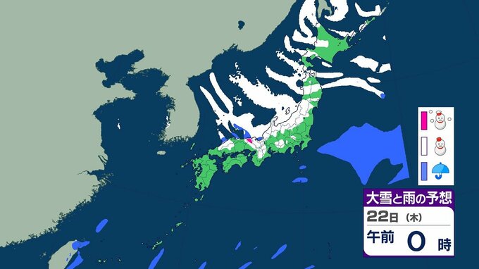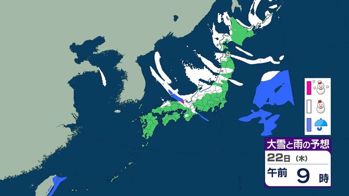 【大雪情報】21~25日ごろにかけ大雪のおそれ 北陸では最大100センチ 東北・近畿では70センチ予想 交通障害などに警戒を 全国の3時間ごとの雪のシミュレーション(気象庁) テレビ山口 2026年1月19日(月) 20:07 国内 22日午前の雨と雪のシミュレーション
