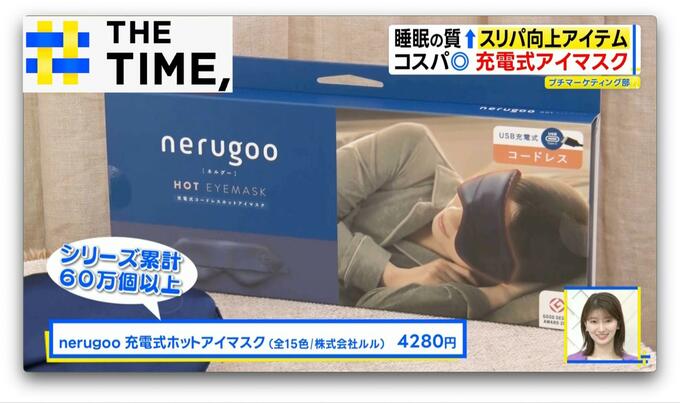 シリーズ累計60万個以上売れたのは「nerugoo 充電式ホットアイマスク」(株式会社ルル/全15色・4280円)。目の疲れに合わせて3段階に温度調節可能で、30分で自動電源OFF機能もついています。