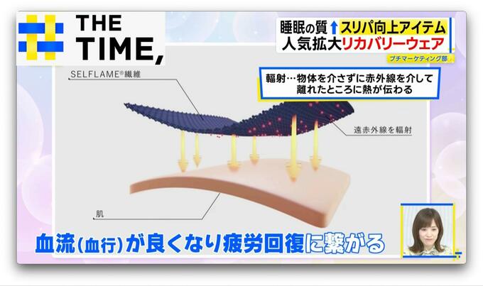 「繊維自体に特殊な加工がされていて、繊維が体から発せられる遠赤外線を吸収し肌に輻射することで血行が良くなり疲労回復に繋がる」