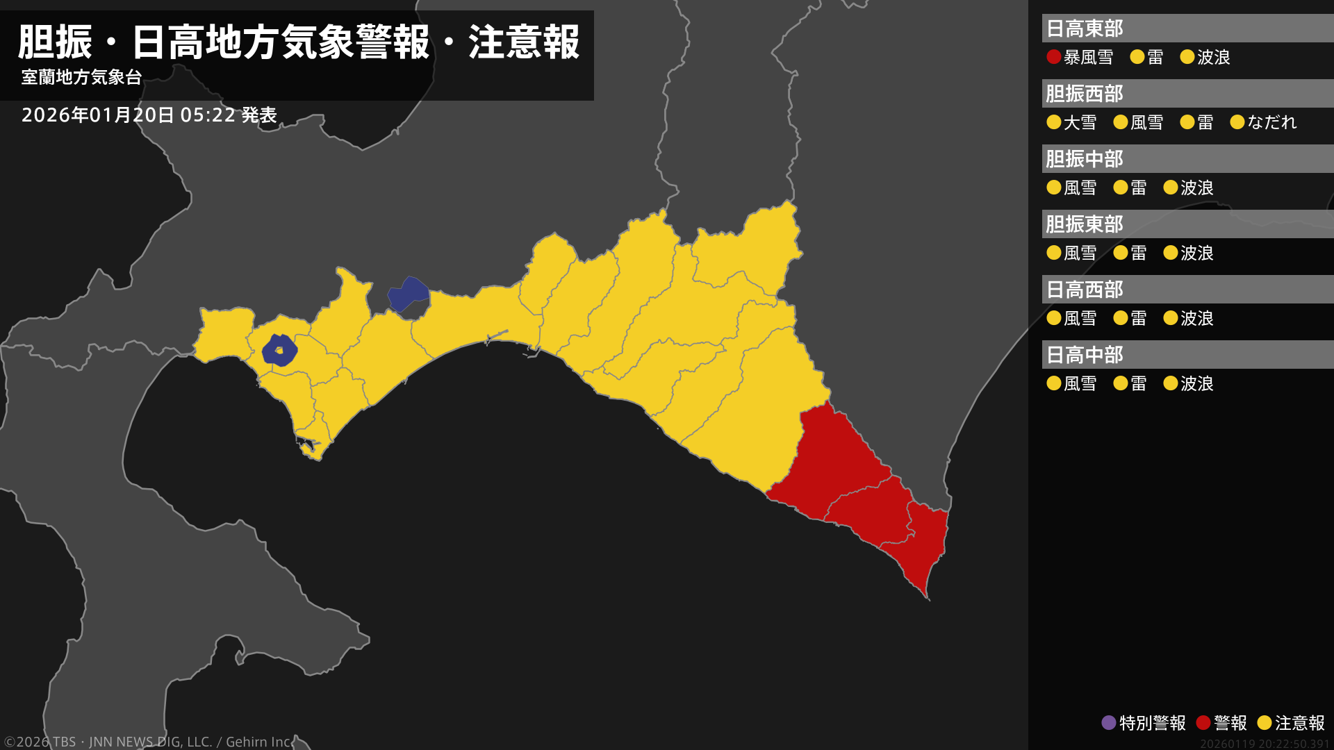 気象台は、午前5時22分に、暴風雪警報を浦河町、様似町、えりも町に発表しました。またなだれ注意報を伊達市伊達、伊達市大滝、豊浦町、壮瞥町、洞爺湖町に発表しました。