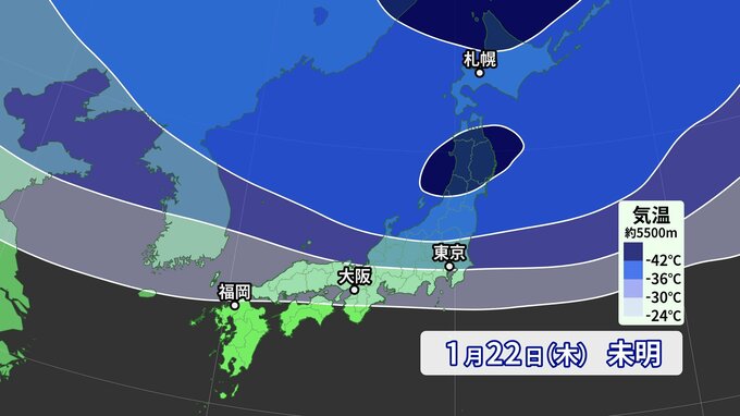 東日本の上空約5000メートルには、25日頃にかけて断続的に氷点下40度以下の強い寒気が流れ込み、西日本の上空約1500メートルには、21日から25日頃にかけて氷点下12度以下の強い寒気が流れ込むでしょう。