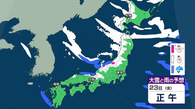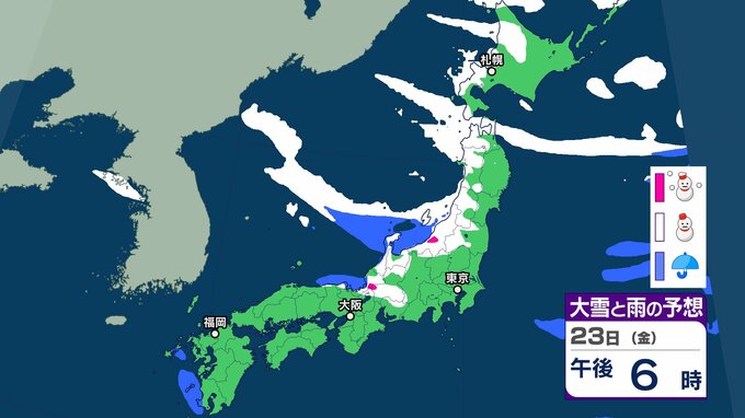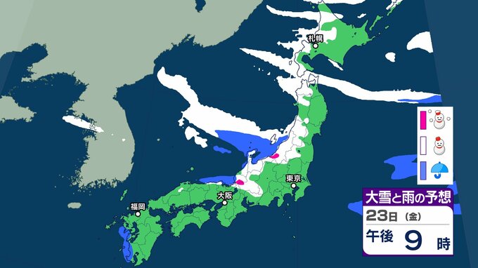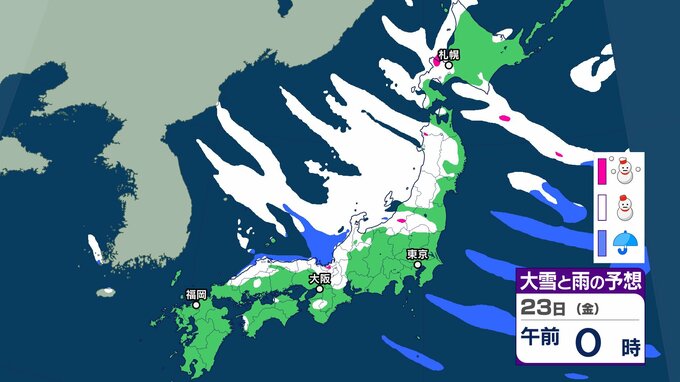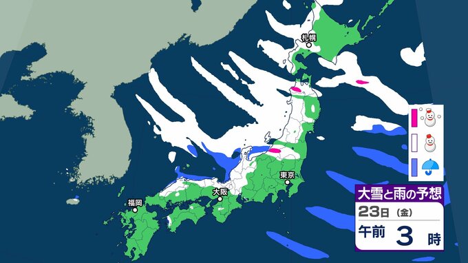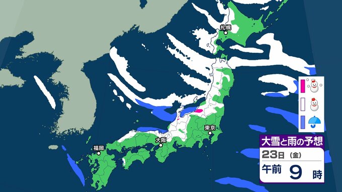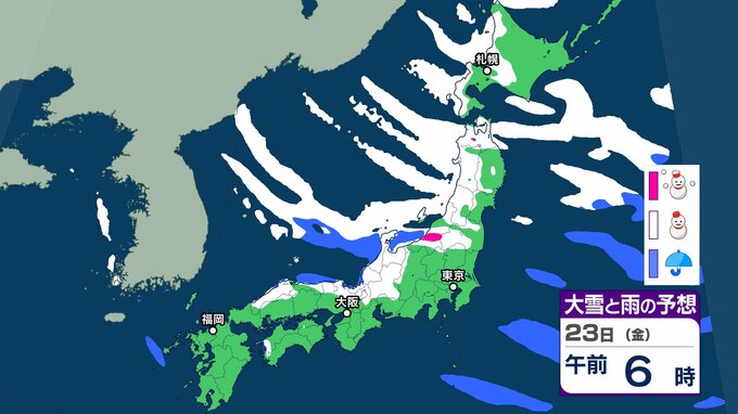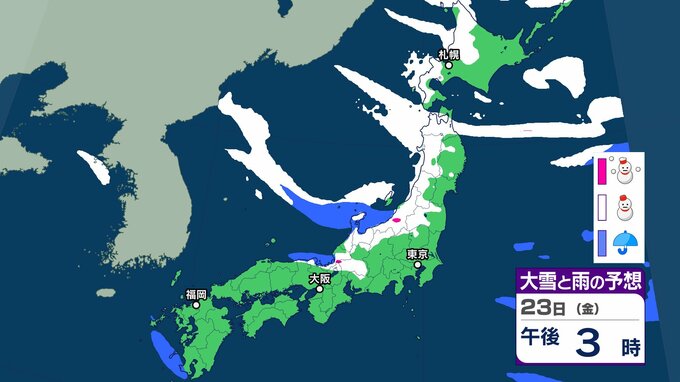 【雪の予想】きょう(20日)は二十四節気の「大寒」→あす(21日)最強寒波襲来、長期化のおそれ 交通障害に注意、警戒を【気象庁 20日(火)~25日(日)の雪雨シミュレーション/20日午前9時更新】 RSK山陽放送 2026年1月20日(火) 08:47 国内 天気 23日(金) 気象庁の雪と雨のシミュレーションをみると、23日は、日本海側を中心に雪の予報となっていて、北海道、北陸など一部地域で大雪となるおそれがあります。
