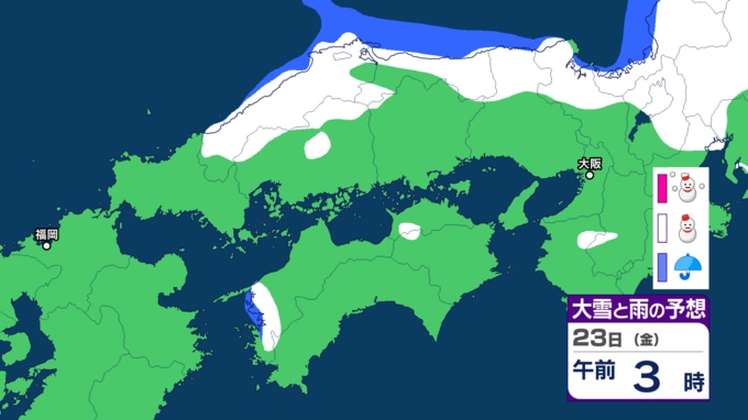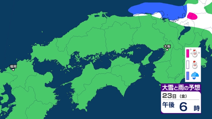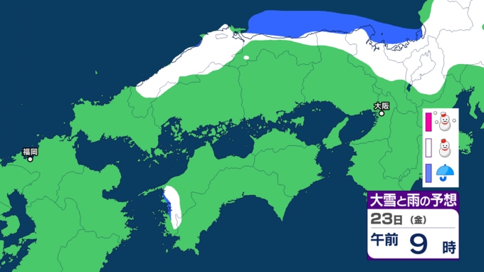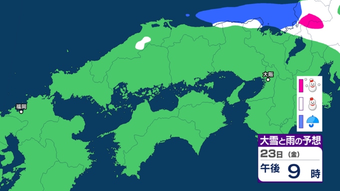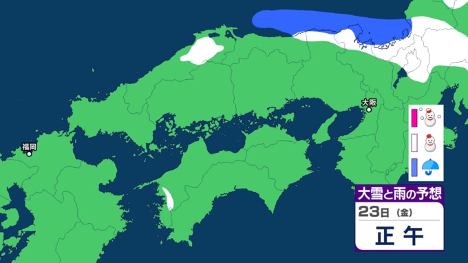 【雪の予報】「居座り寒波」で中国地方はどうなる? 21日(水)日本海に「JPCZ」形成へ、局地的に降雪が強まるおそれ 22日(木)にかけて「警報級の大雪」のおそれ 島根・鳥取・山口・広島・岡山の天気予報【気象庁 雪雨シミュレーション】 RSK山陽放送 2026年1月20日(火) 17:00 国内 天気 23日(金) 気象庁によりますと、23日(金)12時までの24時間降雪量は多い所で40センチが予想されているということです。