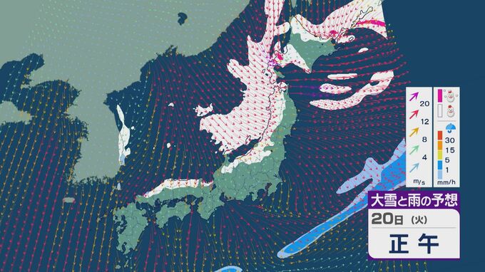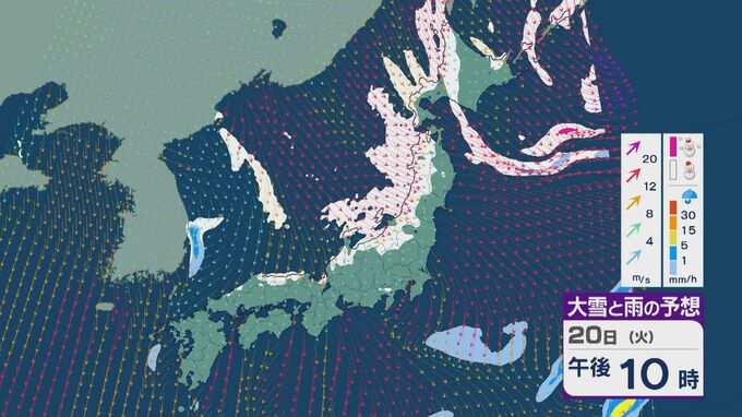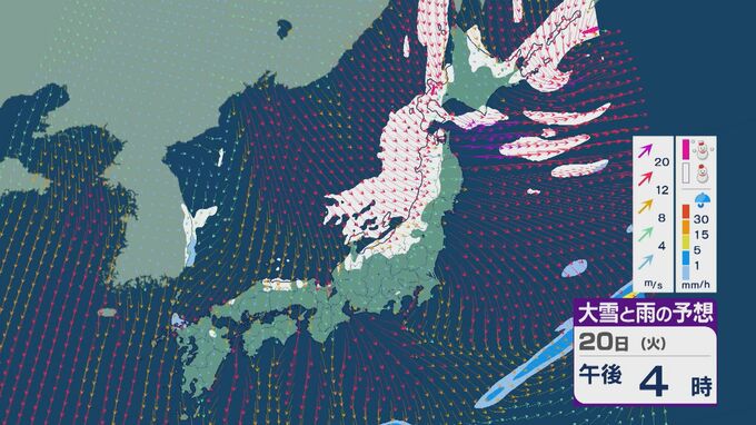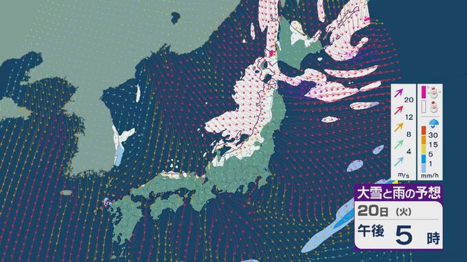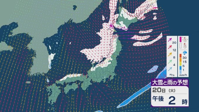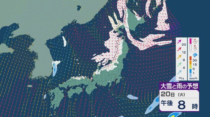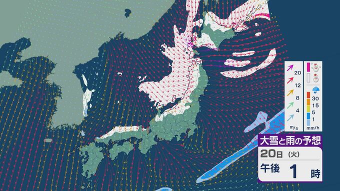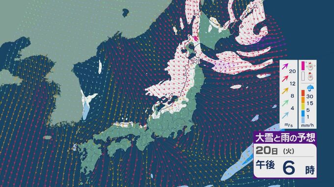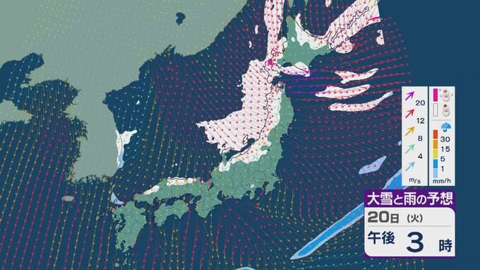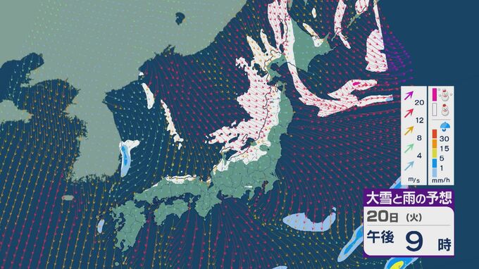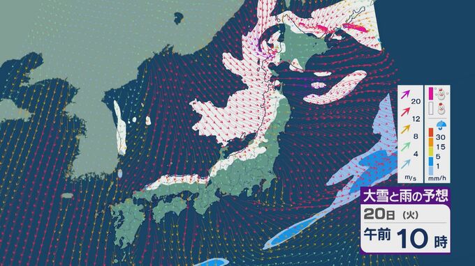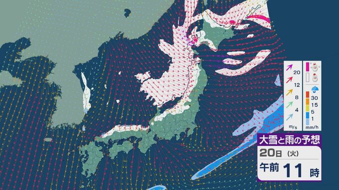 【大雪情報】「大寒寒波」が日本列島を襲う 21日(水)~22日(木)は“JPCZ”による発達した雪雲が北陸や山陰に 日本海側では大雪が週末にかけて続くおそれ 雪と風シミュレーション 北陸放送 2026年1月20日(火) 10:30 国内 20日の雪・雨と風の予想ですが、日中は山陰より東の日本海側で雪が降る見込みです。