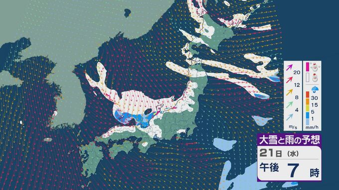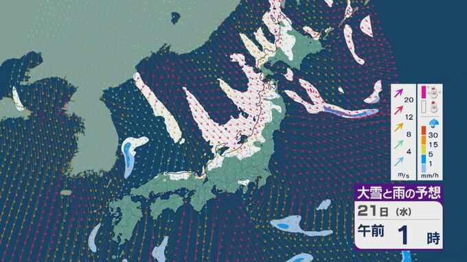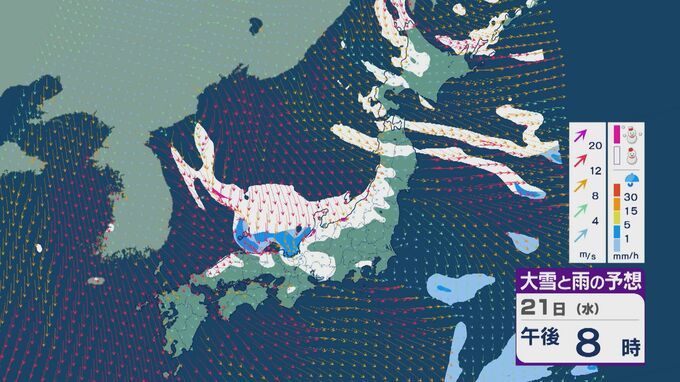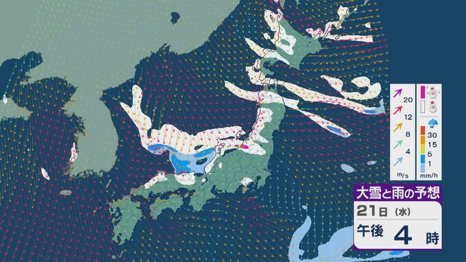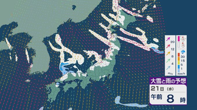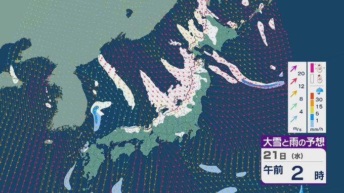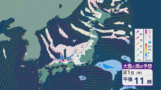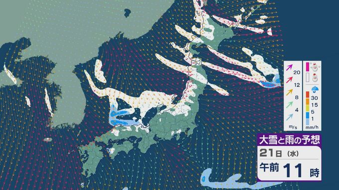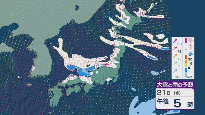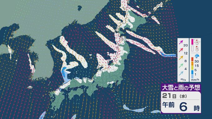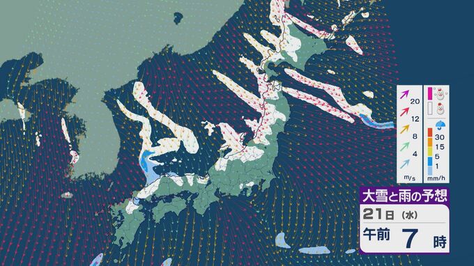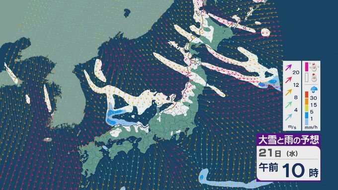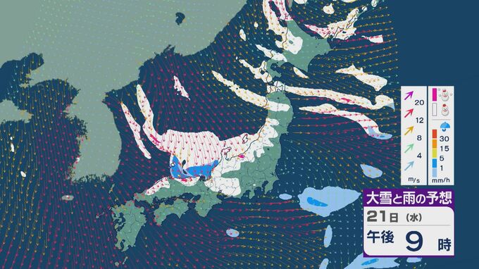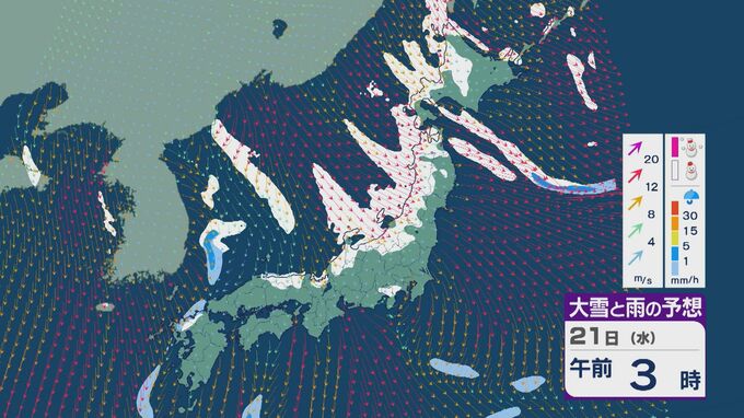 21日も、日本海側では一日を通して雪が降るでしょう。沿岸部を中心に風が強まるところもありそうです。昼過ぎからは、日本海で風が収束することで雪雲が発生するJPCZ(日本海寒帯気団収束帯)の影響を受けそうです。山陰や近畿北部、北陸の福井県あたりに発達した雪雲がかかりそうです。