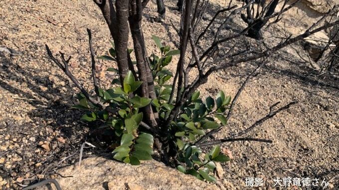 ただ、一見火災で焼き尽くされ枯死したように見える木の中には、その株元から新芽を伸ばしているものもまばらに見られ、激しい火災の中で地上部の大部分が枯死しても、生き残った根元が新たに生命活動を始めている姿を見ることができます。