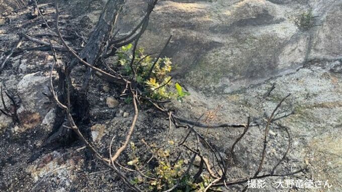 焼けた灰が養分となり、周囲よりも早く成長している可能性も考えられ、火災から9か月が経過した焼け跡に顔を出す新芽には、植物のしたたかな生命力を実感させられました」