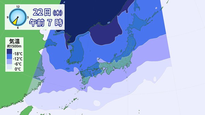 上空1500m付近の寒気の予想を見てみると、週末にかけて平地で雪を降らせる目安の-6℃以下の寒気が日本の南岸まで覆っています。また、21日(水)夜~22日(木)にかけては大雪の目安となる-12℃以下の寒気が、日本海側を中心にかかる予想です。また、さらに高い位置の上空5000m付近には、雪の降り方を強める-40℃以下の強い寒気が、25日頃にかけて断続的に東日本に流れ込む見込みです。