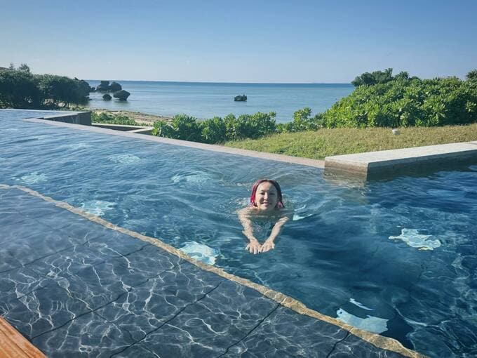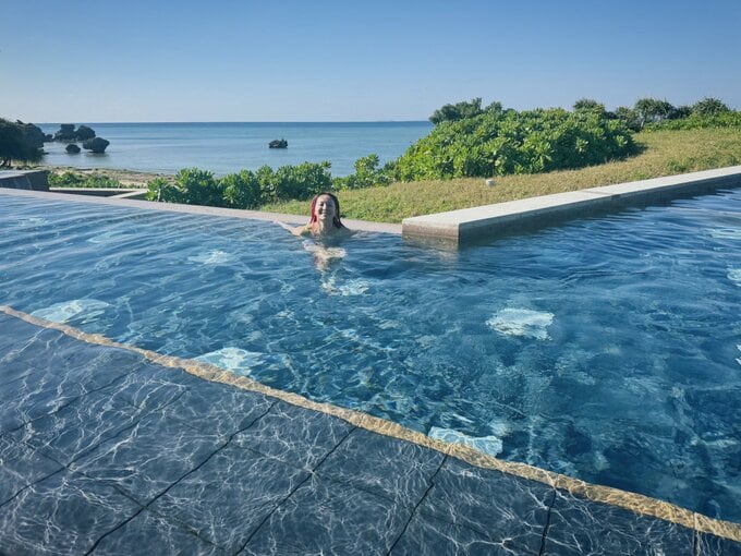投稿された写真からは、美しいインフィニティプールを楽しむLiSAさんの姿や、海岸線の夕景、現地で味わった料理やスイーツの数々が確認できます。特にブルーシールのアイスクリームと思われる写真もあり、沖縄方面を訪れた可能性もうかがえます。