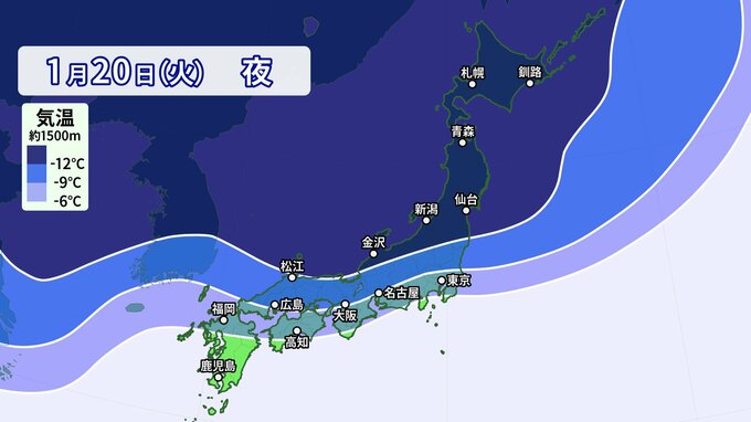 21日(水)には、東京、大阪、名古屋、広島、福岡付近まで-9℃以下というさらに強い寒気が流れ込みます。雪雲の流れ込み次第では、大雪になるおそれがあり、交通に影響が出てもおかしくありません。