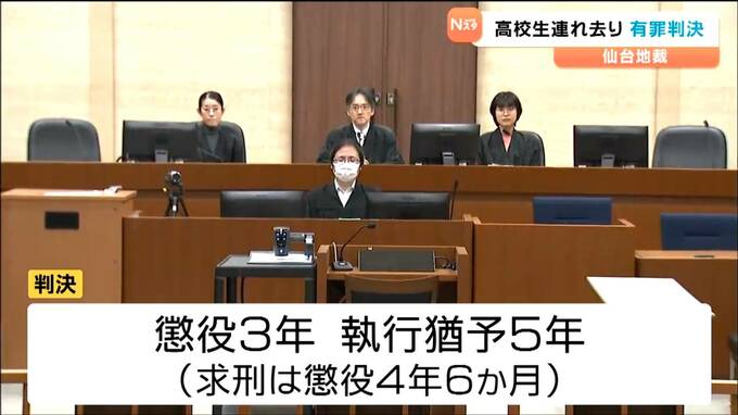 判決公判で仙台地裁の須田雄一裁判長は、誘拐された男子高校生をミャンマーに連れて行った罪については「自力での帰宅や、保護者による追跡を困難にする悪質な犯行」などと述べた。「実刑を選択することも十分ありうる」とする一方、高校生らとの間で示談が成立していることなどから懲役3年執行猶予5年の有罪判決を言い渡した。