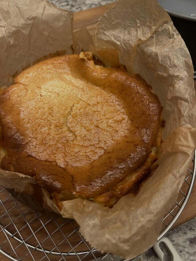 焼き上げたホール状のチーズケーキの画像を添えて、「焼き上がりは、焼き方より上に溢れる位こんもりなのに、冷めると下がりしっかりチーズケーキになりますよね 笑」と、焼き上げた後、時間が経つにつれてケーキの形が変化することについて感想を記しています。