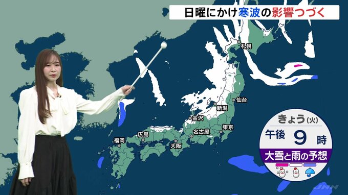 強い寒波の影響で日本海側には雪雲が広がっています。このあと、西日本にも雪の範囲が広がっていきそうです。きょうは全国的に北寄りの風が強く、低気圧の影響で北海道では猛吹雪になるところがありそうです。今夜…