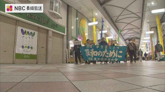 19日は、のぼりやプラカードなどを掲げた14人が市内のアーケードを行進。入港の翌月から毎月19日に実施しており今回で696回目となりました。