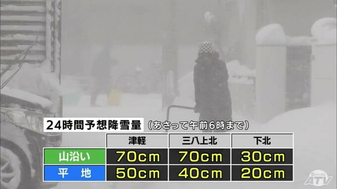 さらに、明後日22日の朝までに「津軽」と「三八上北」の山沿いで70cm、平地で40~50cmと予想されています。