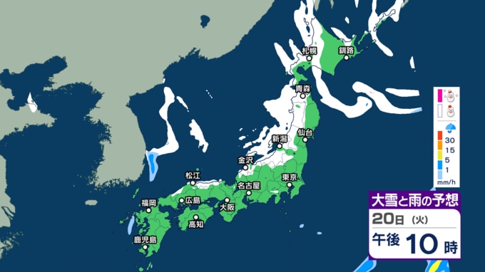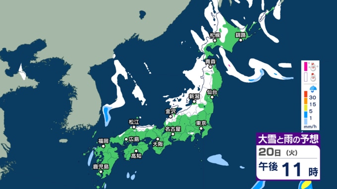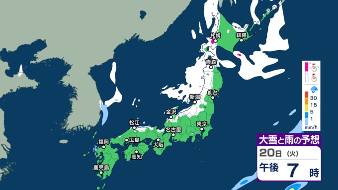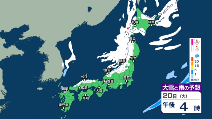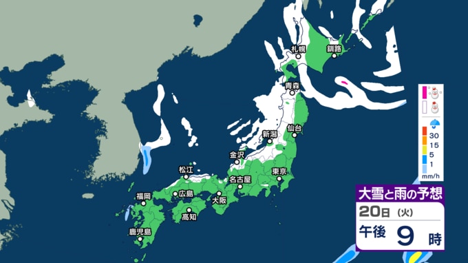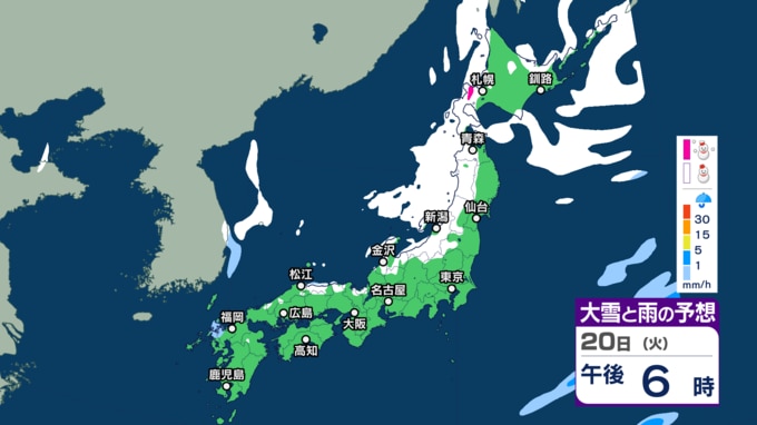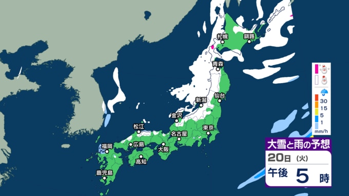 気象庁によりますと、低気圧が日本の東にあり、急速に発達しながら東北東へ進んでいます。また、別の低気圧が日本海北部をゆっくり南下していて、20日午後は北海道に進むでしょう。日本付近は、20日は冬型の気圧配置が次第に強まり、21日から25日頃にかけて強い冬型の気圧配置が続く見込みです。