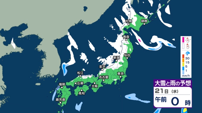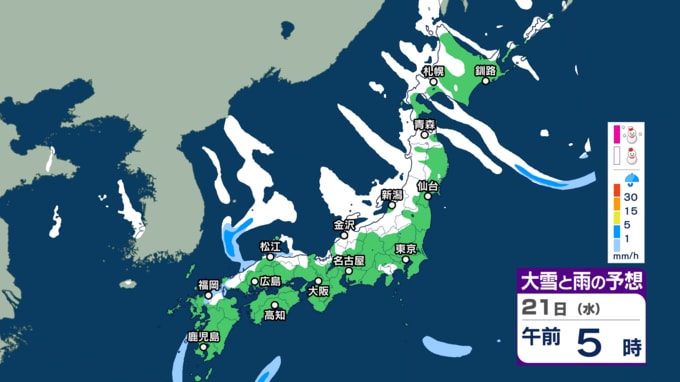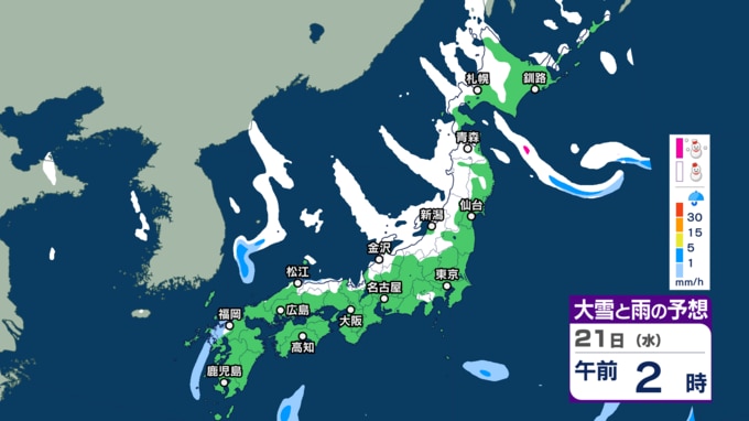 北日本から西日本では日本海側を中心に、山沿いや山地だけではなく、平地でも大雪となる所があり、短時間に降雪が強まるおそれがあります。また、普段雪の少ない太平洋側でも大雪となる所がある見込みです。